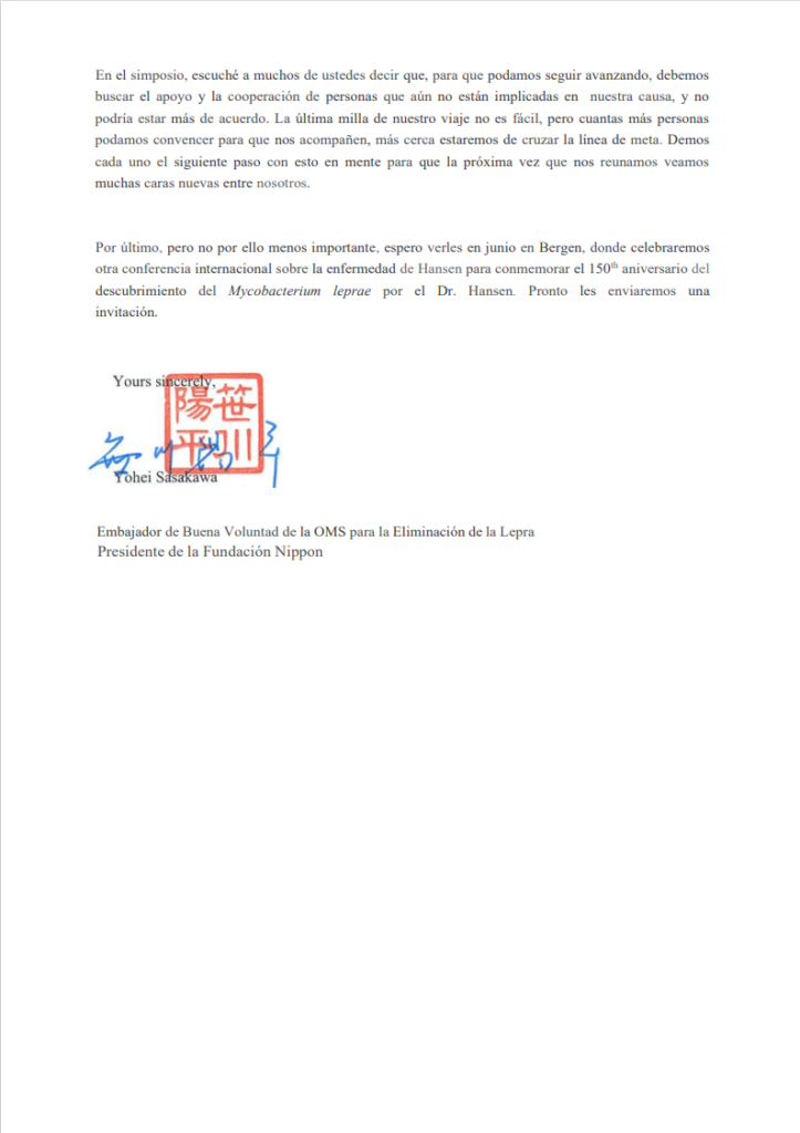 Queremos compartirles una carta enviada por la Fundación Sasakawa para todos los miembros de Felehansen. Esta misiva nos llena de entusiasmo para seguir trabajando por lograr vencer el estigma y la discriminación hacia las personas afectadas por la enfermedad de Hansen – Lepra y sobre todo a continuar llevando la información sobre la prevención y el adecuado tratamiento de esta patología.
