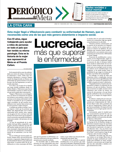 Desde FELEHANSEN, queremos dar las gracias al «Periódico del Meta», uno de los medios de comunicación más importantes en los llanos orientales de Colombia, por la nota periodística realizada a nuestra presidenta, la señora Lucrecia Vásquez, con motivo de la nominación al premio «Mujer Cafam 2023».