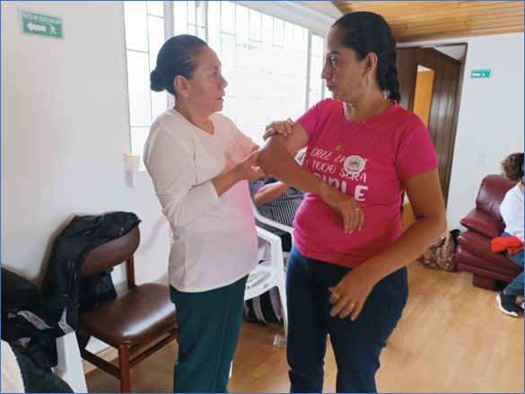 Los líderes tuvieron un espacio práctico en el que realizaron ejercicios sobre cómo abordar a la persona afectada y cómo realizar la valoración. En la fotografía se observa que los líderes están realizando la palpación de nervios.