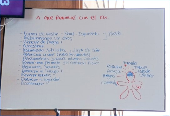 La imagen muestra una lista de las cosas a las que los participantes del taller han renunciado a partir del diagnóstico de la enfermedad de Hansen o lepra, y que han modificado de manera significativa su forma de vivir.