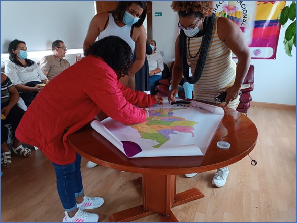 En el taller de caracterización y mapeo, se proporcionó a cada nuevo líder un mapa del departamento (Atlántico, Bogotá, Bolívar, Cesar, Huila, Magdalena, Meta, Sucre y Valle del Cauca) para identificar los municipios donde se encuentran las personas afectadas por lepra y así priorizar acciones en estas zonas.