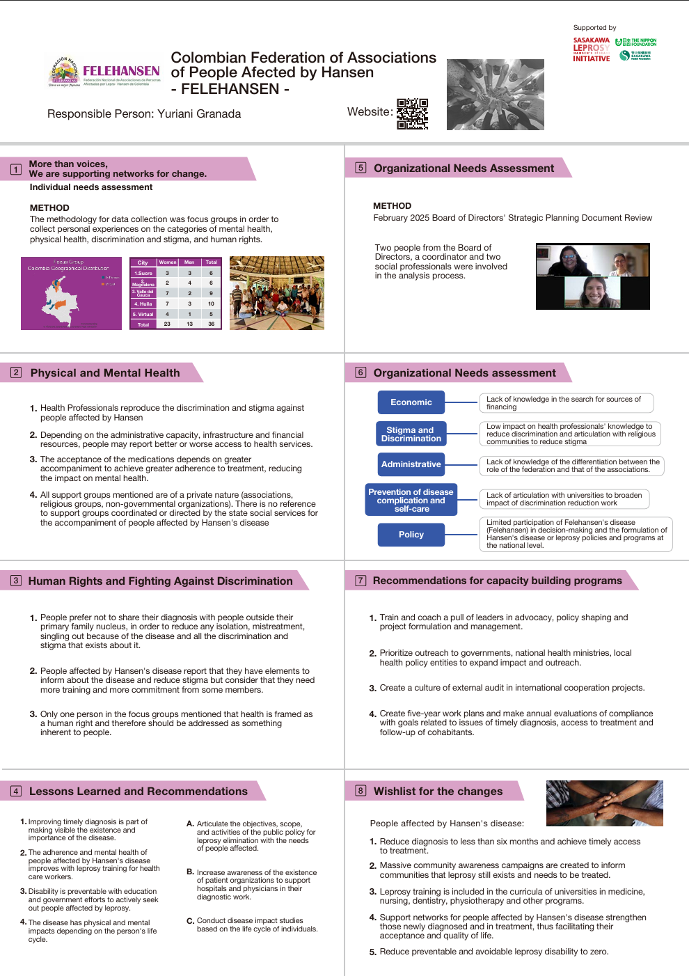 Con la financiación de Sasakawa Health Foundation (SHF), Felehansen e Indonesia iniciaron en 2024 un proyecto para fortalecer el liderazgo de jóvenes becarios entre 18 y 35 años afectados por la enfermedad de Hansen. Tras una convocatoria altamente competitiva, ocho jóvenes líderes fueron seleccionados para recibir formación y apoyo de sus asociaciones territoriales, convirtiéndose en una experiencia transformadora orientada a hacer realidad sus sueños y proyectos de vida.